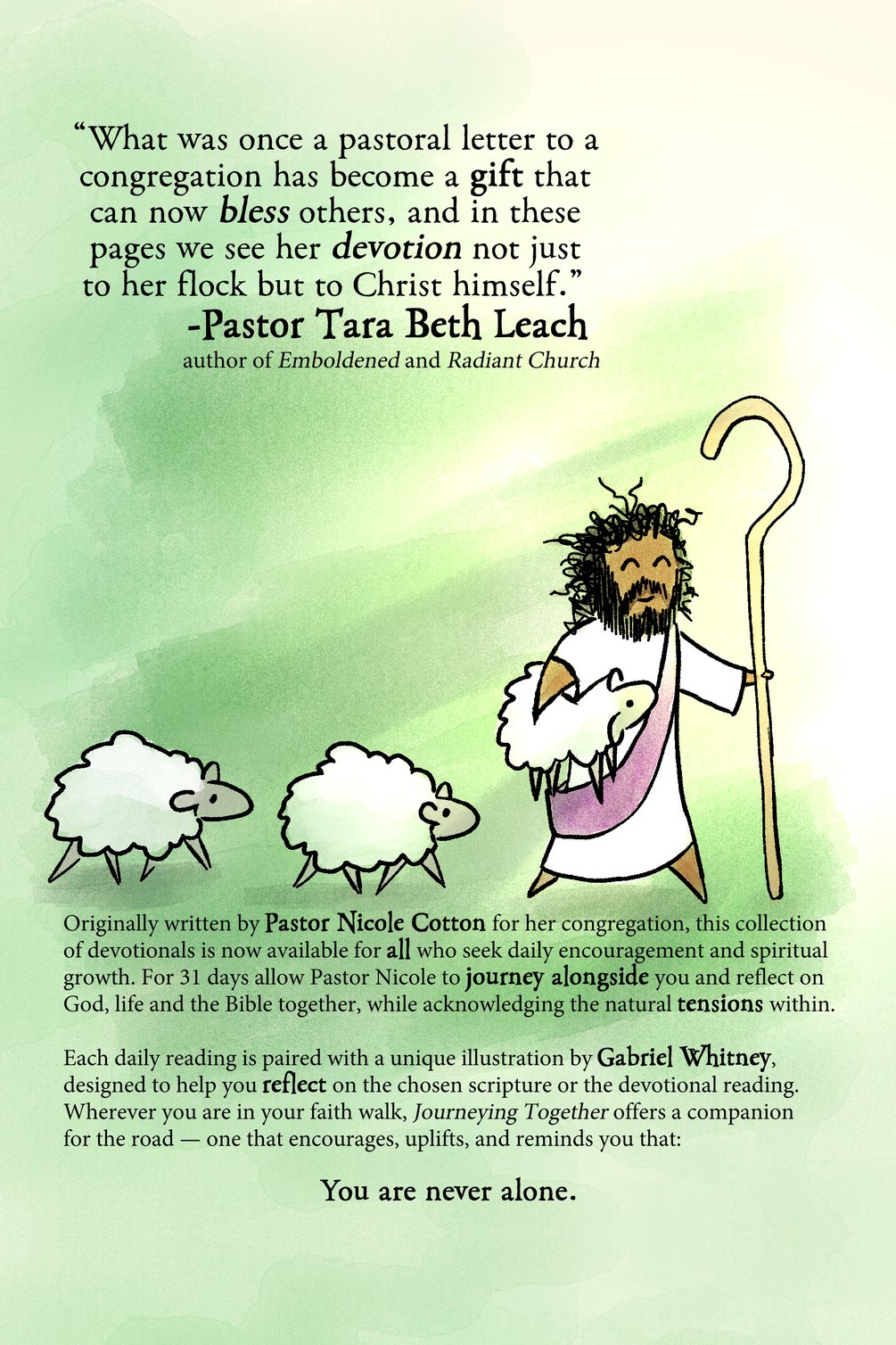 For 31 days, let Reverend Nicole Cotton journey alongside you and offer her wisdom and perspective on life, God, and the Bible. Each devotional in this book features a scripture passage to read for each day, along with accompanying thoughts from Reverend Cotton. It also features a unique illustration for each devotion, by Gabriel Whitney to help highlight some of the themes and ideas talked about and to encourage reflection.